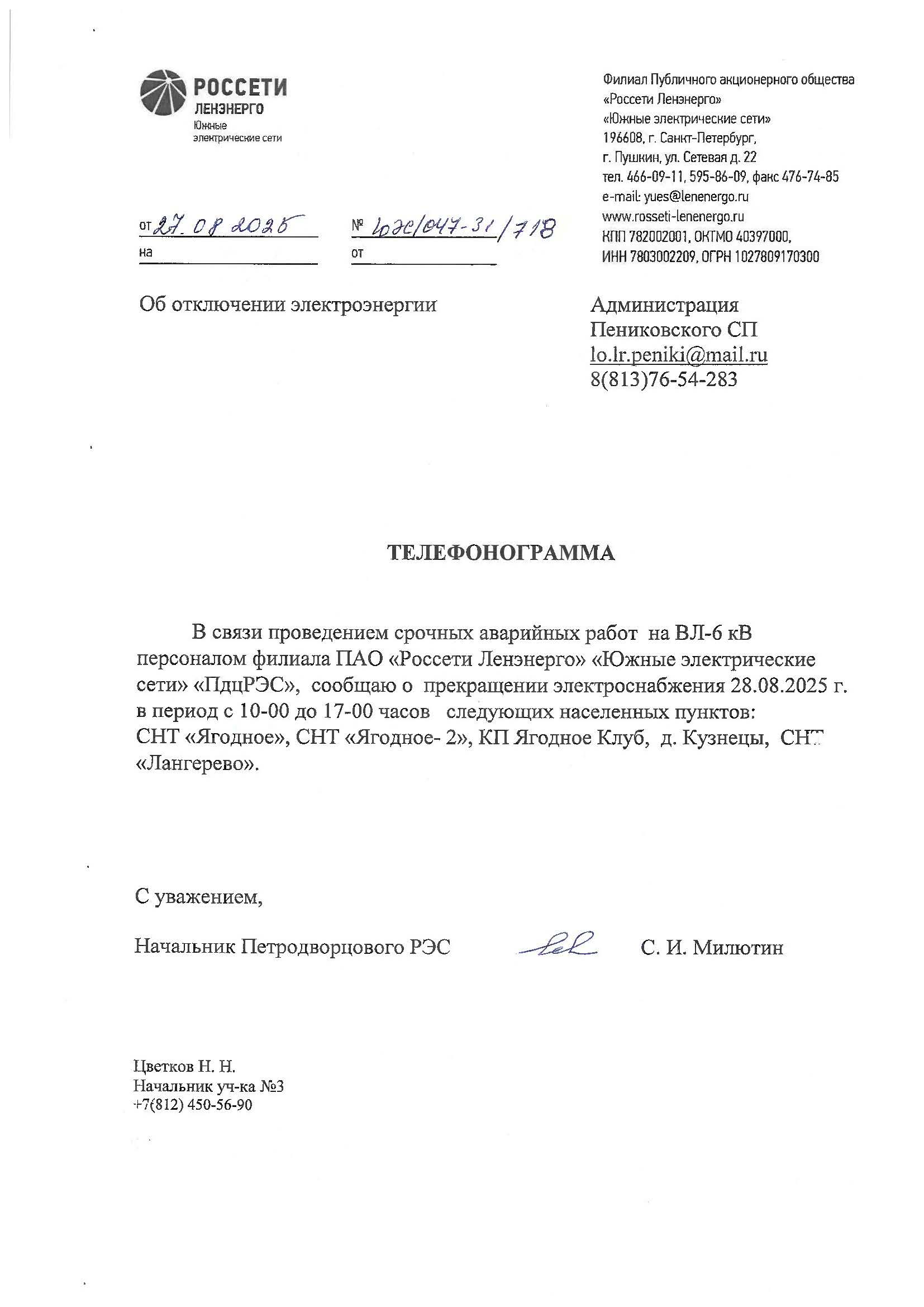 28.08.2025 г. с 10:00 до 17:00 ч. будет временно приостановлено электроснабжение Опубликовано 27.08.2025 в рубрике Новости